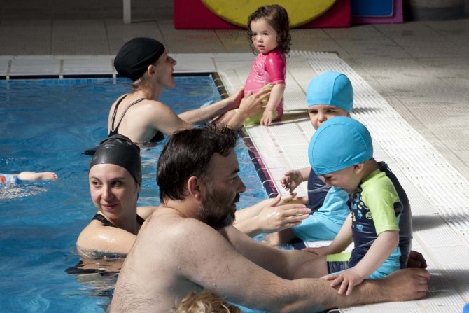 Edu, de dos años, se acaba de sumergir completamente por primera vez y mientras realiza ejercicios con la ayuda de su madre, Elena, se parte de risa más de una vez. “Le costó tres clases adaptarse y ahora le encanta”, explica ella. En el agua también está Jero, que tiene dos años. En el baño le acompaña su padre, Nacho. “La natación me parece un deporte muy completo y es muy relajante”, considera. No irá muy desencaminado, ya que asegura que los días que Jero practica natación duerme mucho mejor.